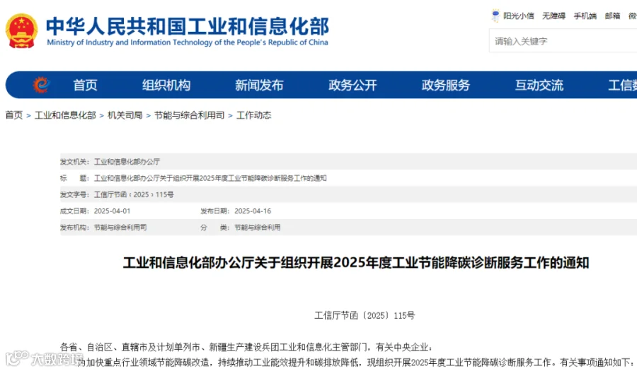 4月16日,工信部办公厅印发了《关于组织开展2025年度工业节能降碳诊断服务工作》的通知。(以下简称:节能降碳诊断通知)