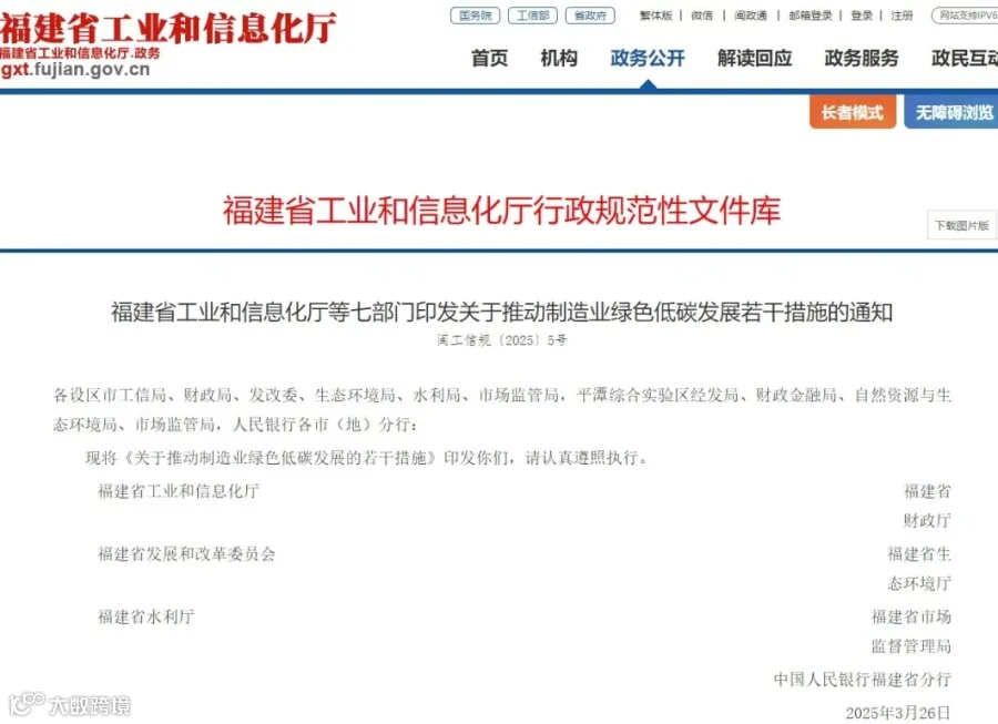 3月26日,福建省工业和信息化厅等七部门印发《关于推动制造业绿色低碳发展若干措施》的通知。(以下简称:绿色低碳发展通知)