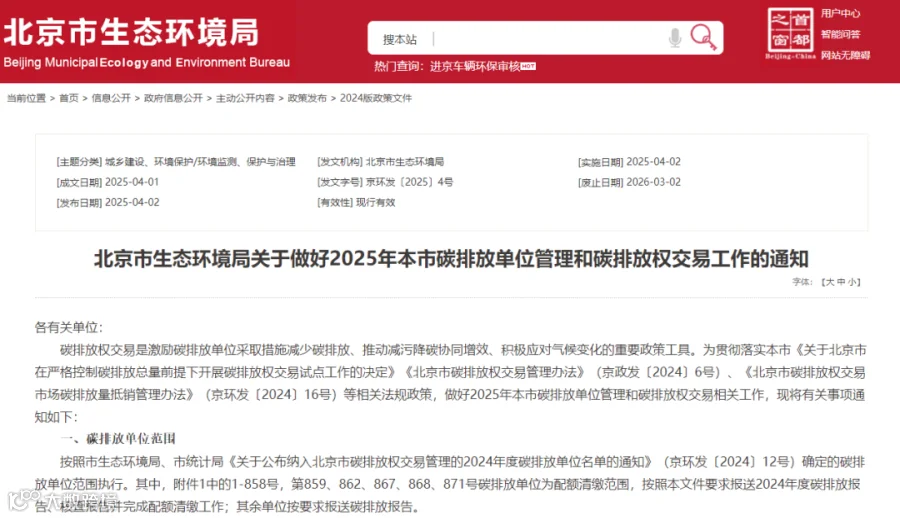 4月1日,北京市生态环境局印发《做好2025年本市碳排放单位管理和碳排放权交易工作》的通知。(以下简称:碳排放工作通知)