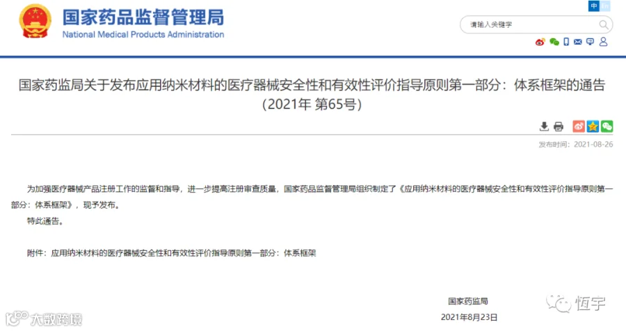 國家藥品監督管理局組織製定了《應用納米材料的醫療器械安全性和有效性評價指導原則第一部分:體系框架》