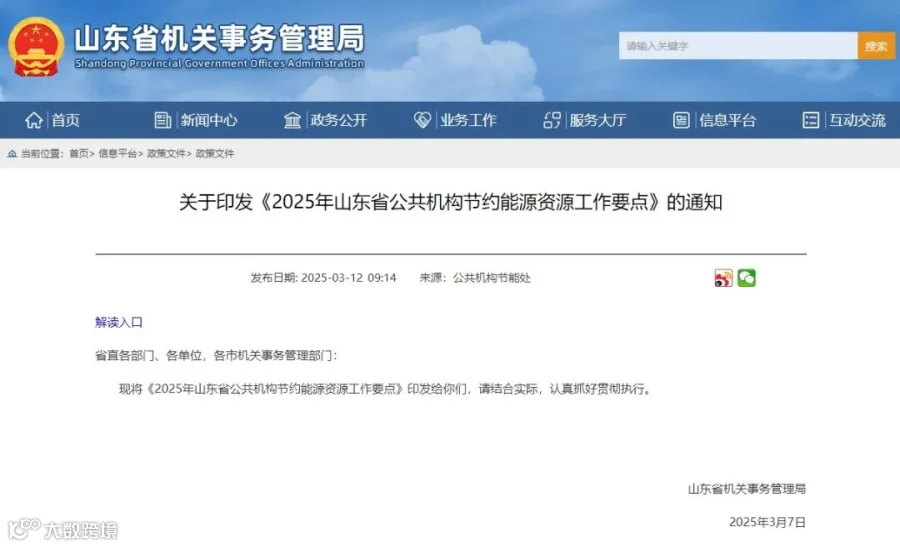 3月12日,山东省机关事务管理局印发了《2025年山东省公共机构节约能源资源工作要点》的通知(以下简称:能源工作要点)。