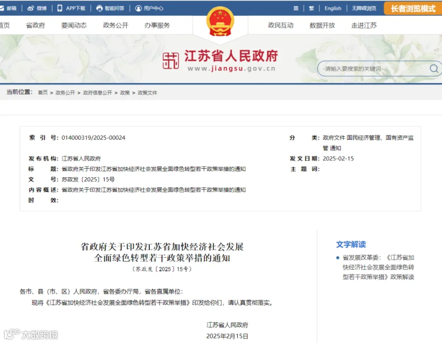 2月15日,江苏省人民政府印发了加快经济社会发展全面绿色转型若干政策举措的通知(以下简称:绿色转型通知)。