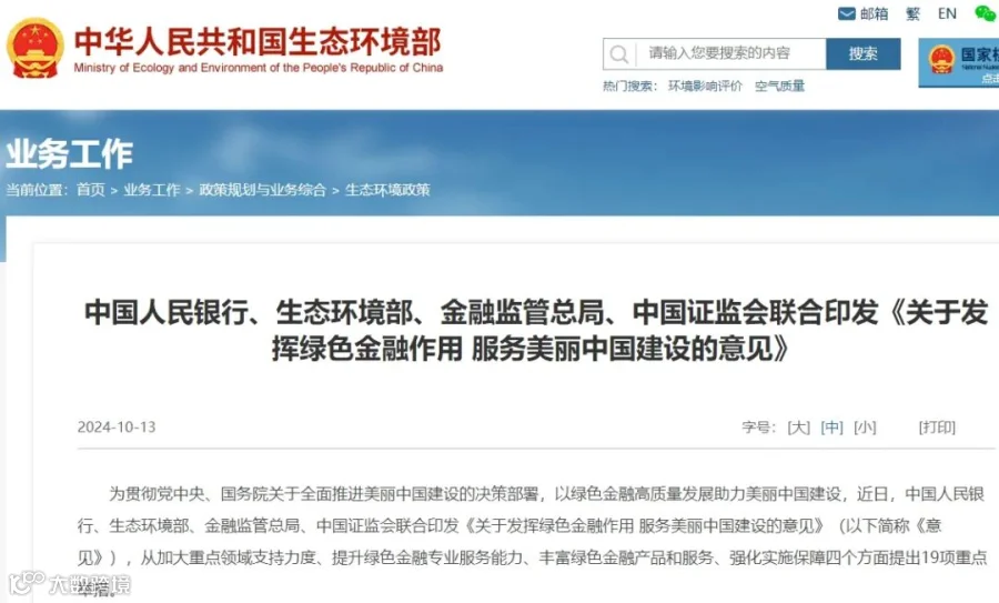 10月12日,中国人民银行等四部门,联合印发了《关于发挥绿色金融作用 服务美丽中国建设的意见》,从加大重点领域支持力度、提升绿色金融专业服务能力、丰富绿色金融产品和服务等四个方面提出了多项重点举措。