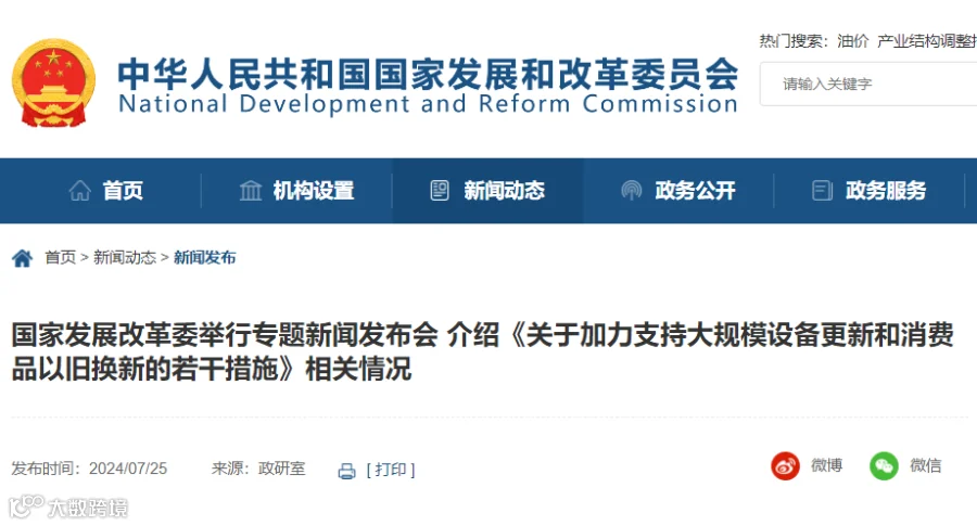 7月25日下午,国家发展改革委举行专题新闻发布会,就加力支持企业设备更新,消费品以旧换新政策衔接、支持范围、对消费市场的影响,等方面问题回答记者提问。