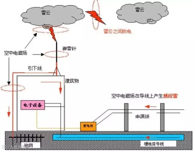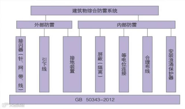 接闪:现场所有可能遭受直击雷的部位应安装接闪器(避雷针、避雷带或避雷网)、引下线,并接入接地装置,将雷电流引入地下泄放。