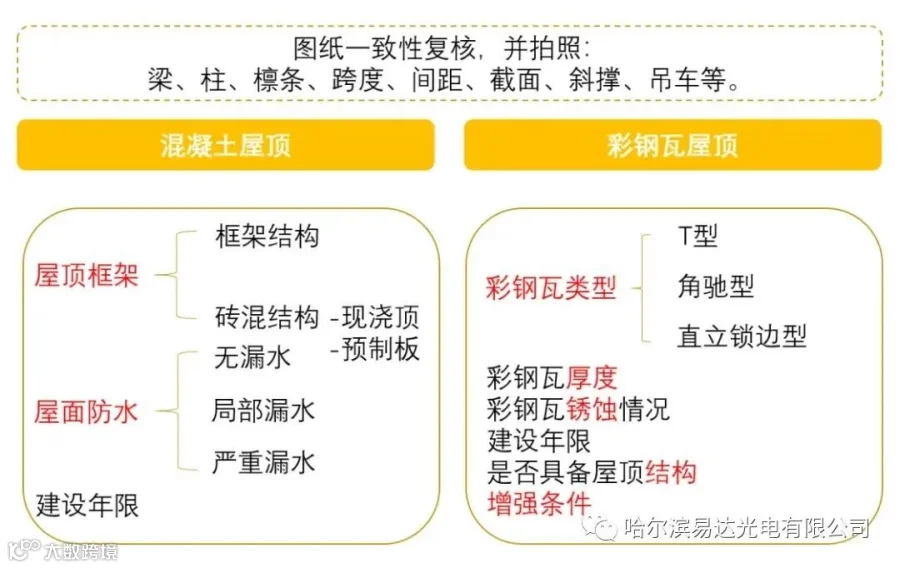 •考察屋面结构(混凝土、彩钢瓦)、屋顶使用年限和面积(至少2万平米以上)。