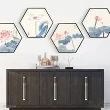 六边形交错排列:最近六边形愈发广泛的被设计师们所应用,将六边形画框和水墨画相结合有意想不到的效果。