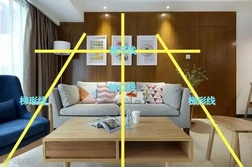 水平遵从“等腰梯形原则”,即以画的两个上直角为起点,到沙发扶手两端为终点相连能成为一个等腰梯形。这样视觉上不会头重脚轻。