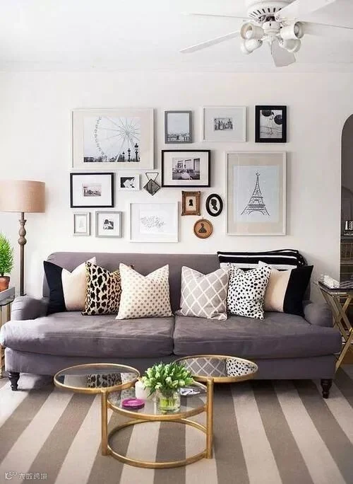 方形:小居室客厅大概率会选择双人座小沙发。墙面装饰画,围绕着沙发中心,不可喧宾夺主。色块面积要适中,善于运用画框台纸。设计摆放时,要随时注意与沙发的整体搭配。