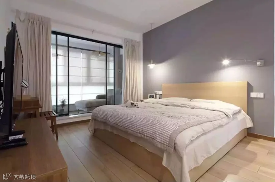 次卧和主卧共享一个长达7米的大阳台,采光非常好,窗帘后实际上是四联动移门,可以通往阳台。