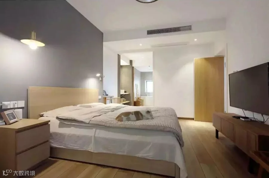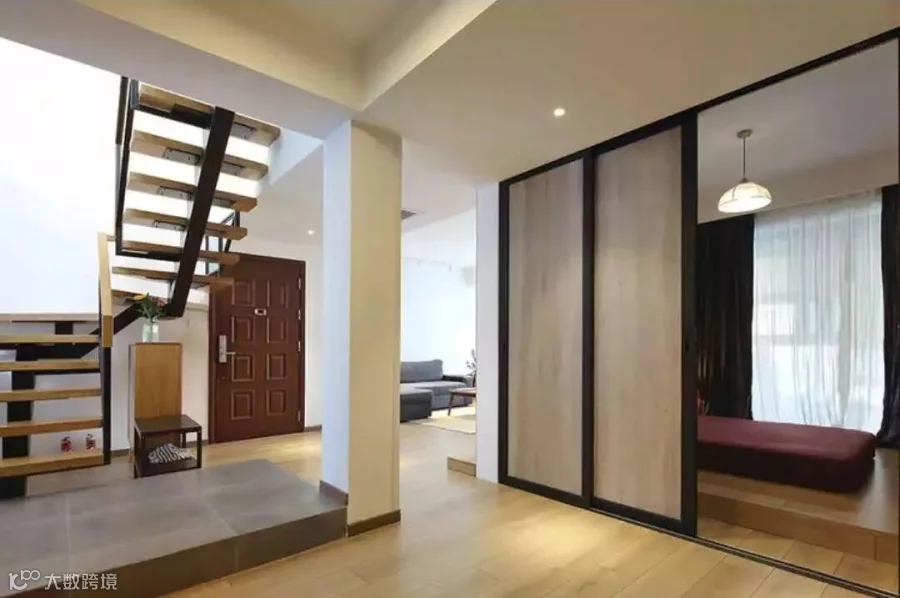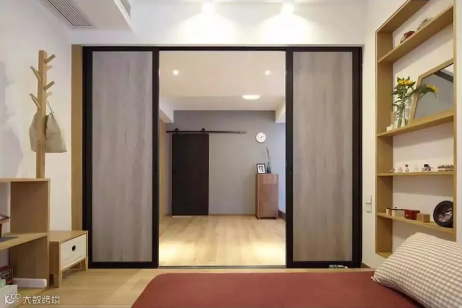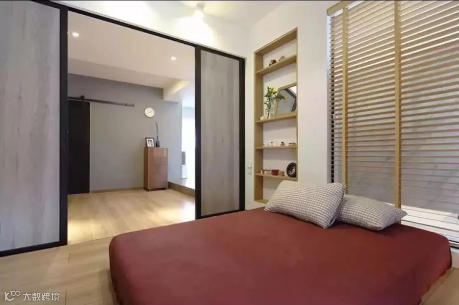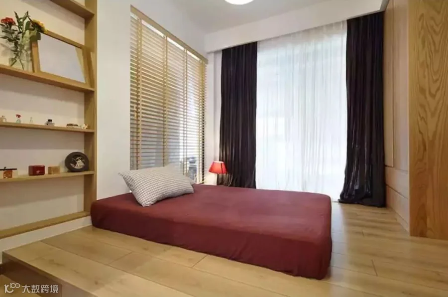 次卧采用日式地台、推拉门设计。推拉门特别采用上轨道,隐藏在吊顶里面,解决了很多屋主担心的地面轨道不好清洁的顾虑。