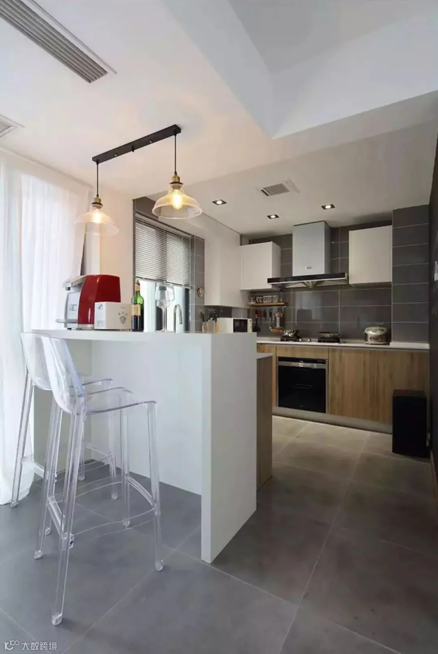 拆除了餐厨隔墙后,把阳台纳入了餐厅区域,扩大餐厨空间。落地窗边还设置了吧台,迎着百叶窗中透出的丝丝缕缕阳光,每一天都从美好的早餐时光开始。生活就是需要一些仪式感。