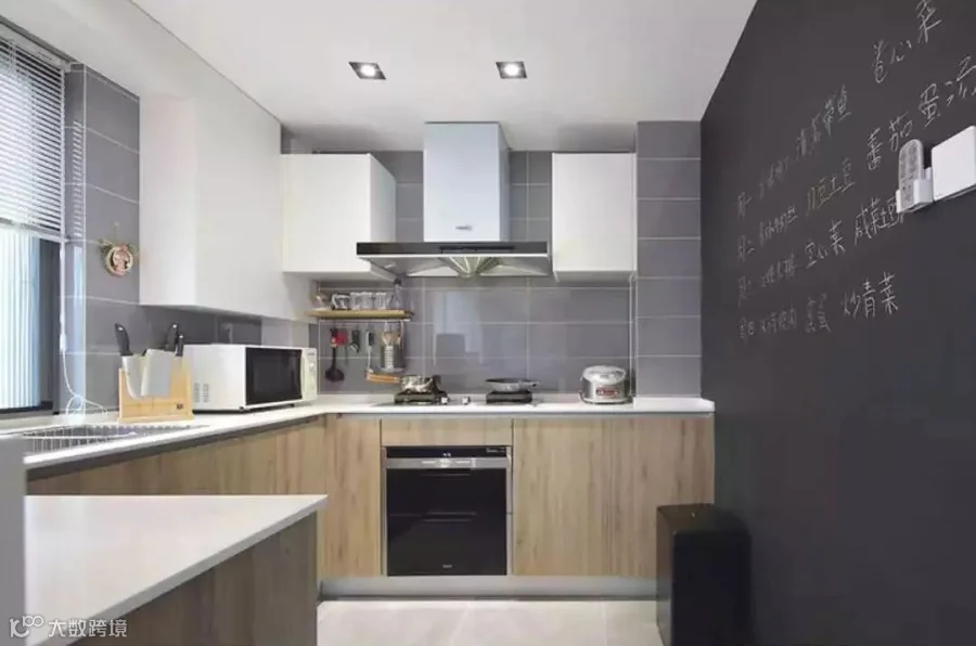 厨房的一面墙涂刷了黑板漆,写着每周菜单,装了遥控凉霸,让每一次下厨拥有享受生活的幸福感而不是负担感。