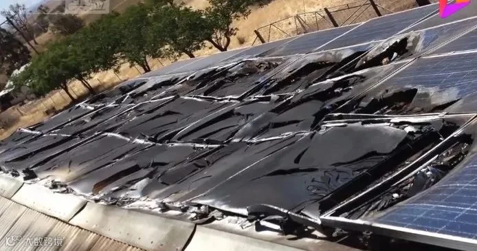 工作人员当然也考虑到了这个问题,他们又准备了一块在火灾中被烧掉一大半的太阳能电池板,然而测试发现面板仍会漏电,而且电压在12V-15V之间,12V电压在水流作用下跳转到300V,所以太阳能电池板一旦出现破损就要注意了,更不能用水清洗。