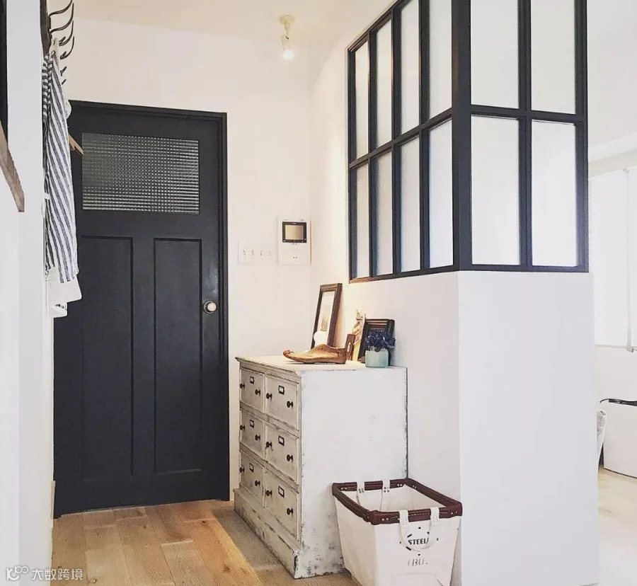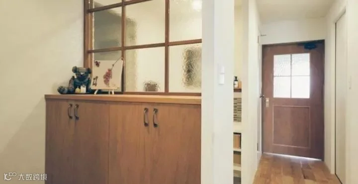 在玄关地方装一扇室内窗,透过毛玻璃向客厅借点光。让人一进门就能感受到家的温暖。