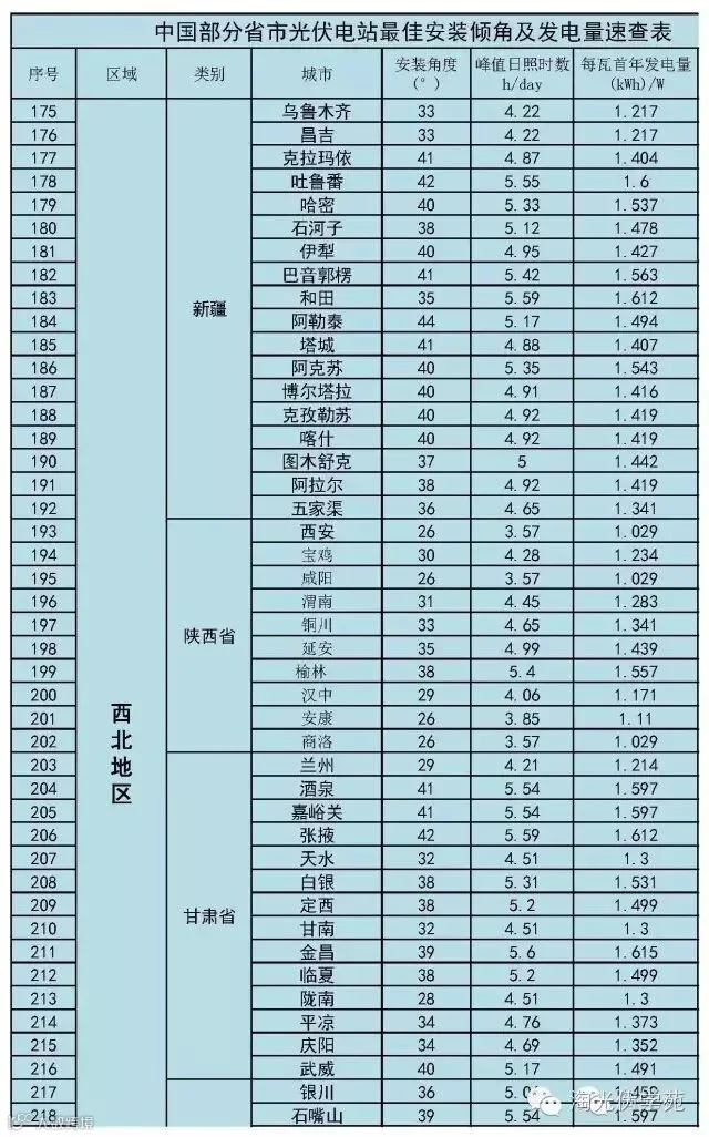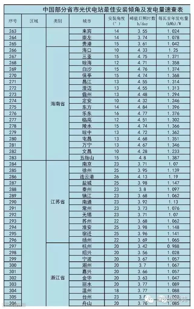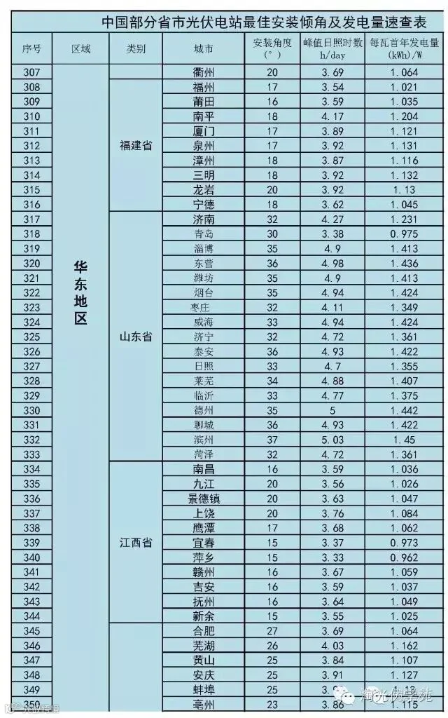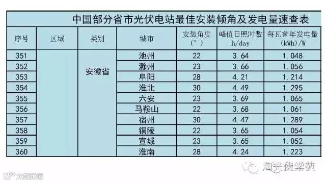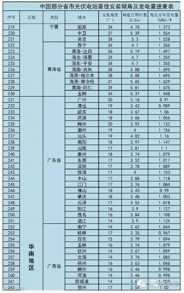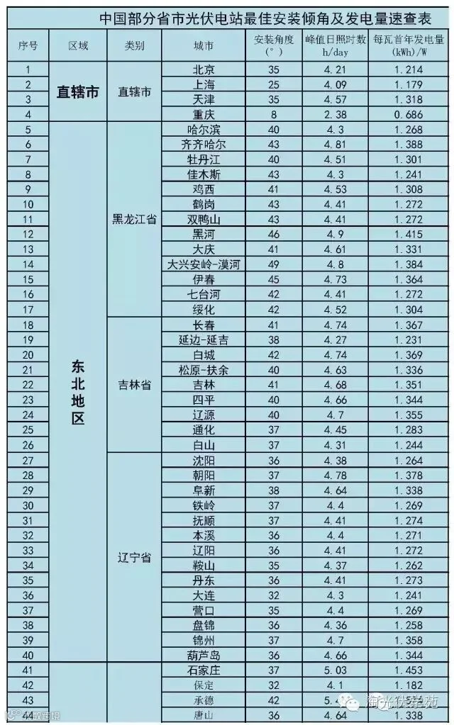 (2)、速查表已根据当地经纬度换算出组件的最佳安装倾角;