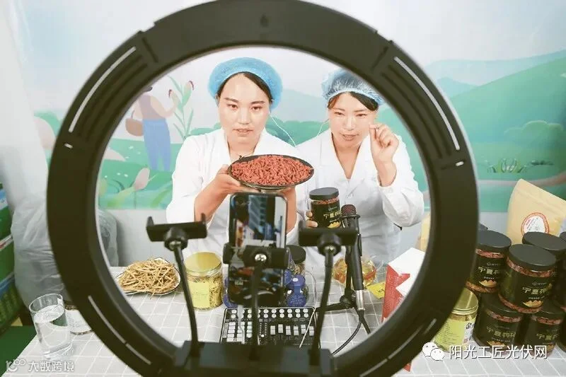 “闽宁禾美”是在闽宁扶贫协作推动下,在宁夏闽宁镇原隆村建设的一个消费扶贫品牌和电商孵化基地。该基地通过“企业+扶贫车间+贫困户”的模式,引领特色产业发展,让村民就近就业,稳定脱贫致富。图为2020年6月11日,村民在家门口的电商扶贫车间直播销售当地特色农产品。中新社记者 于晶/摄
