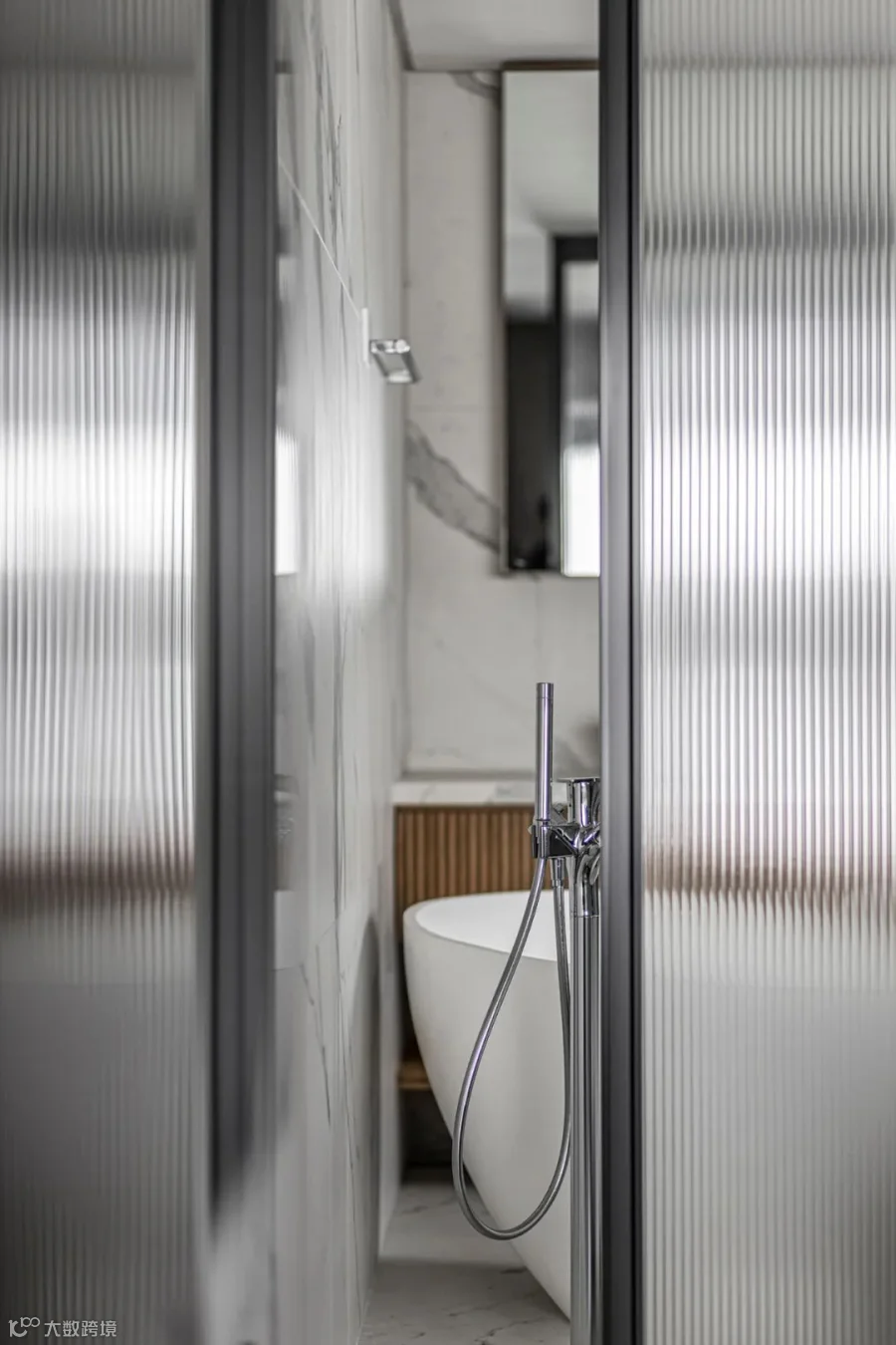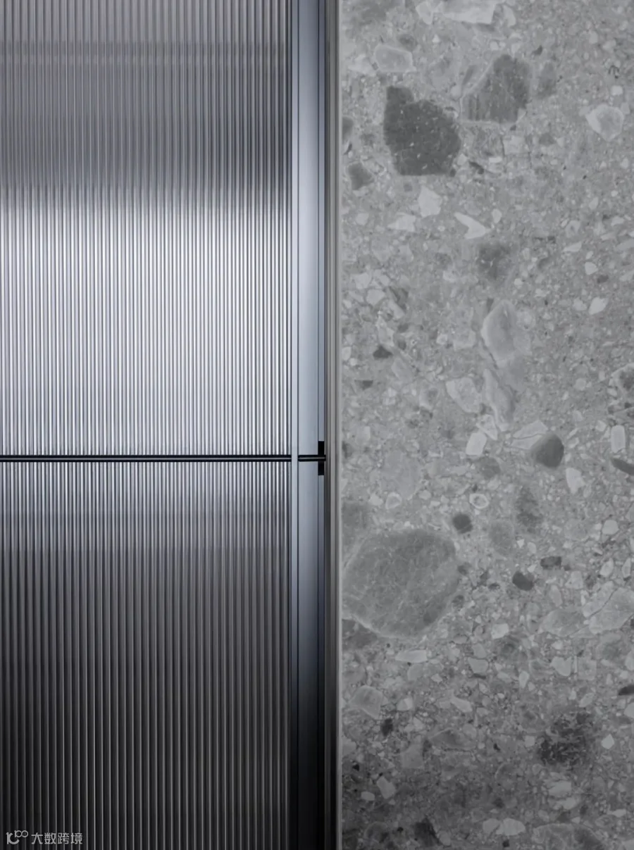 站在客餐厅之中,一轴两界。地面的材质划分了空间的场域,在心中是种内敛的界线,却增添彼此间的互动距离。