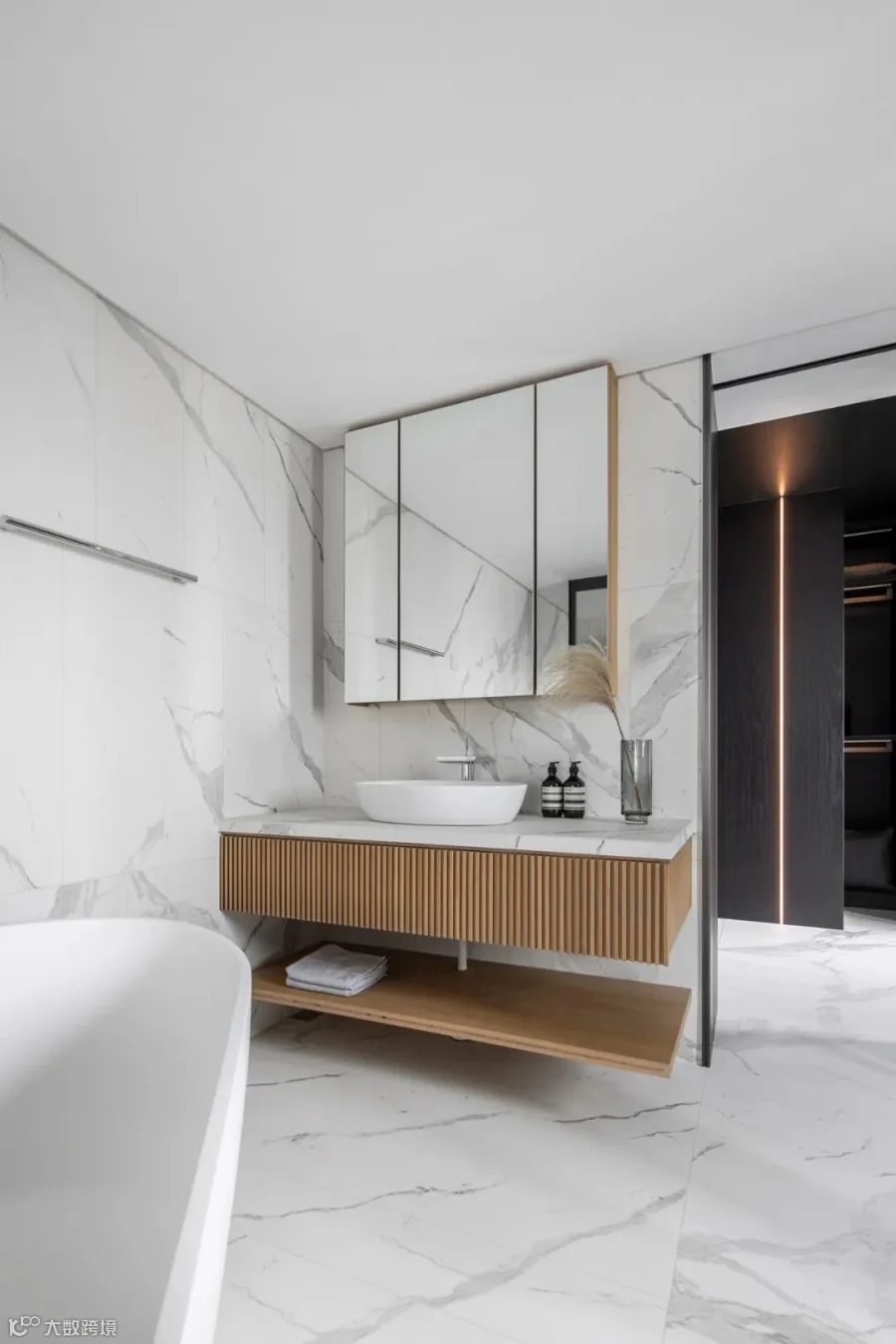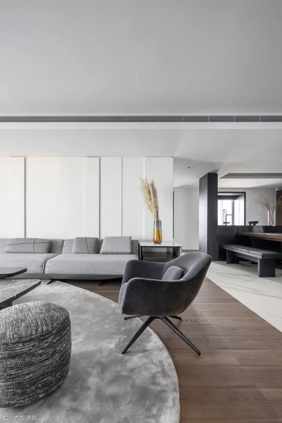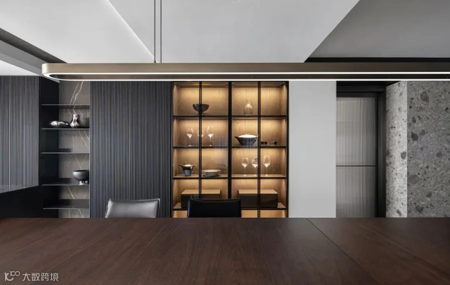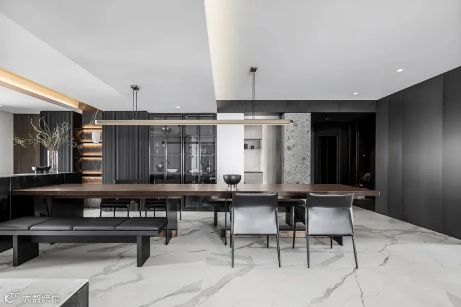 空间聚集点以中岛为轴,长桌为辅,打破客餐厅之交界,足温下材质的转变又不失场域的围塑感。
