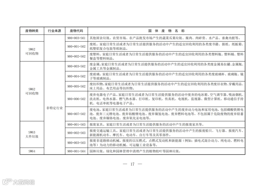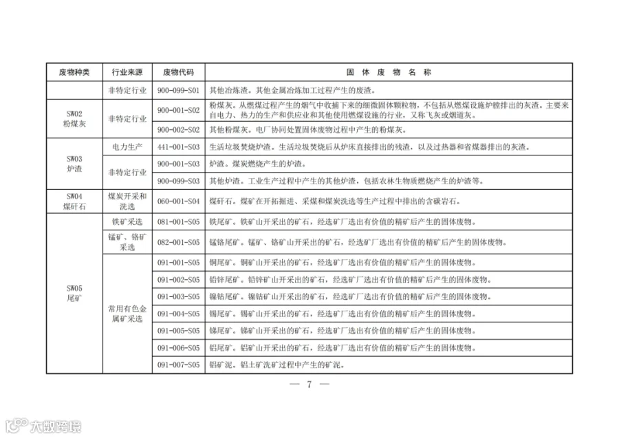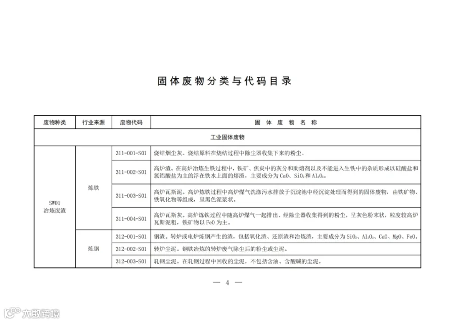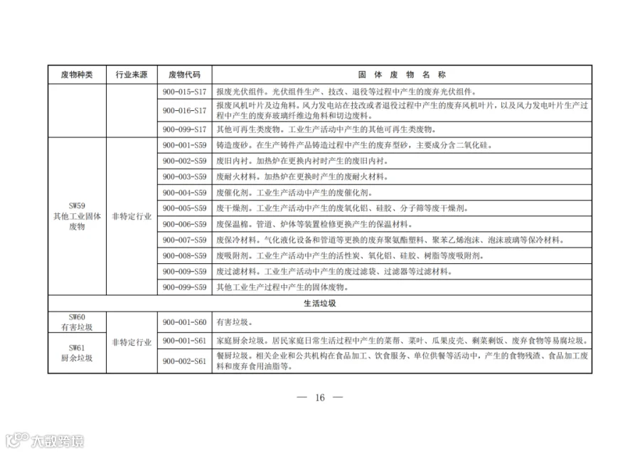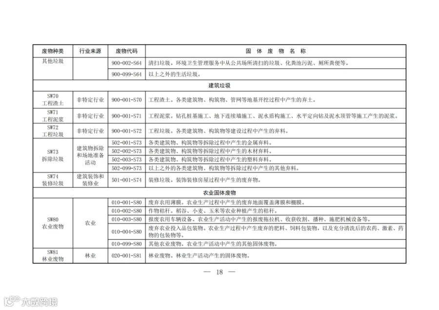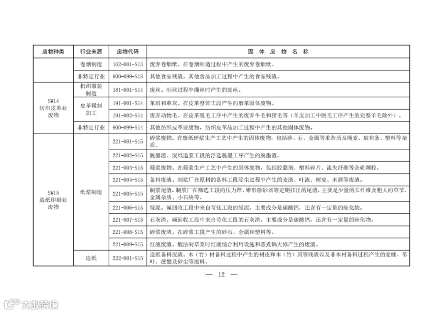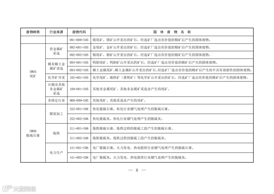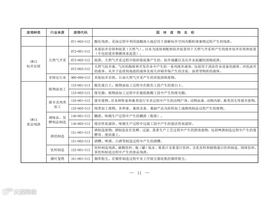 固废分类与代码目录中明确了固体废物的种类、行业来源、废物代码以及固体废物名称。