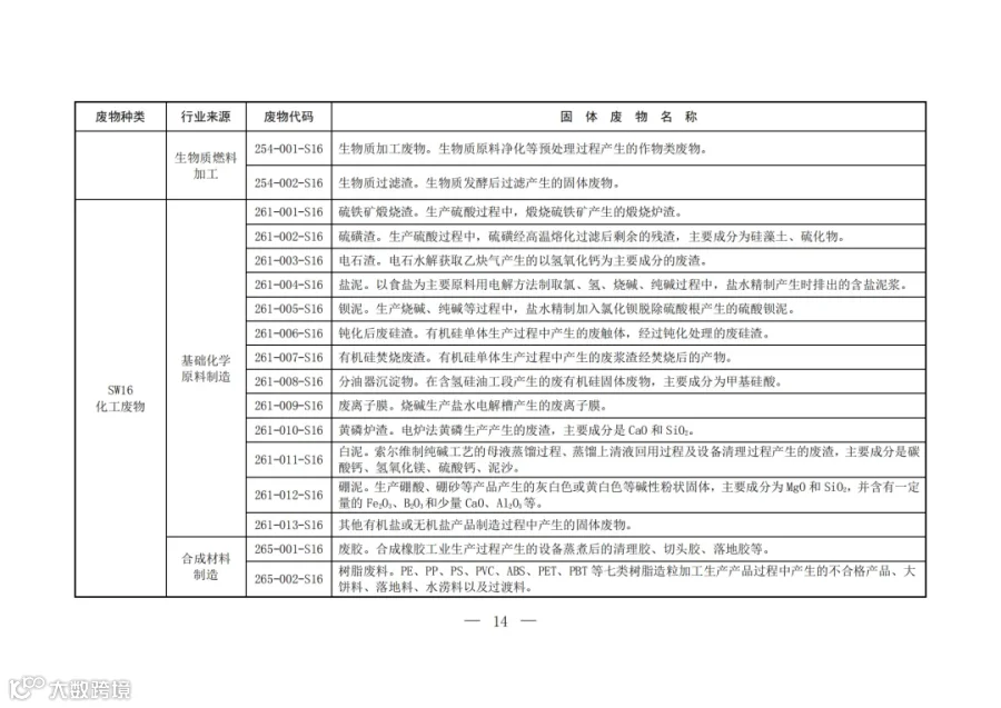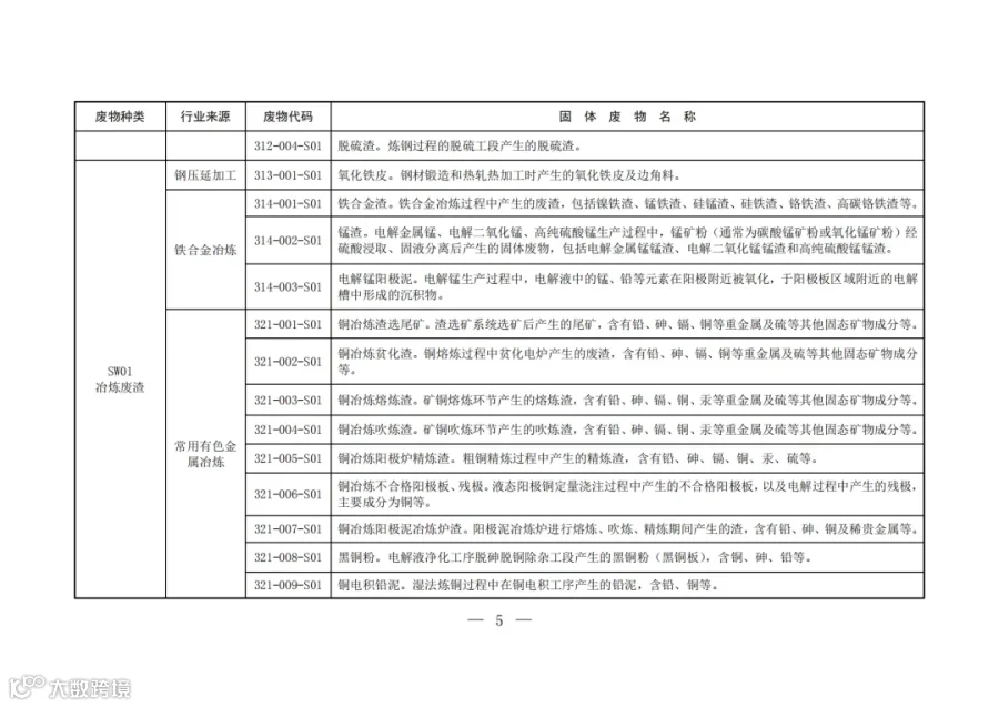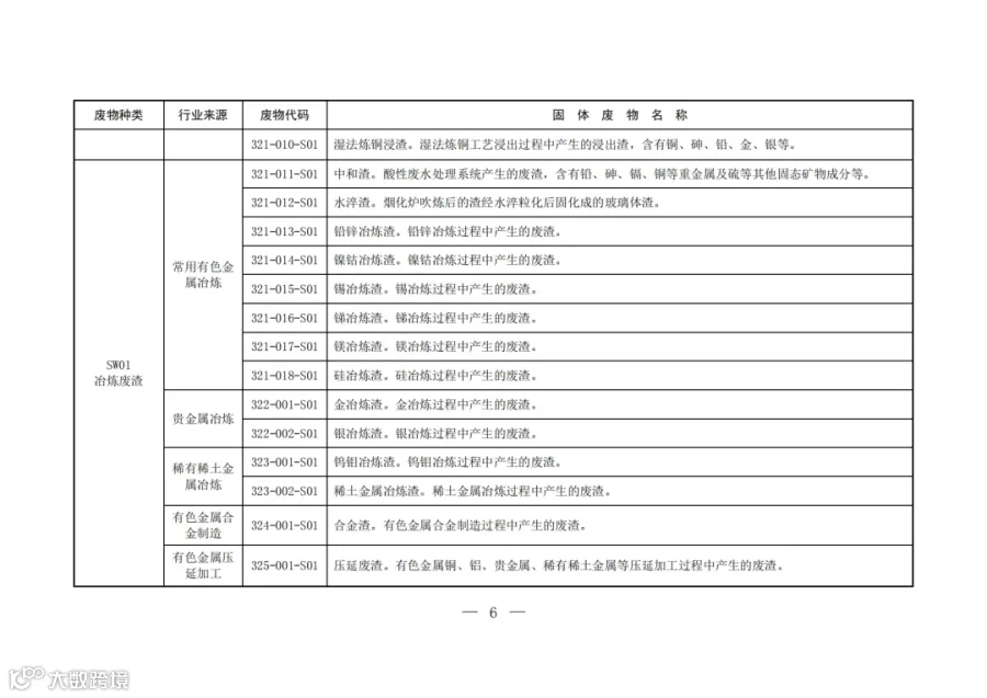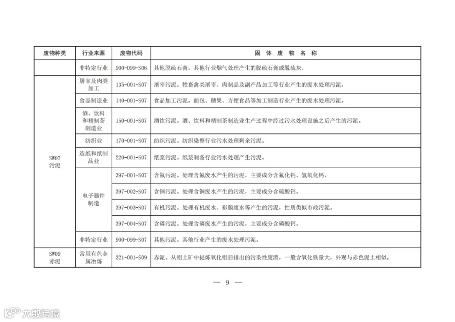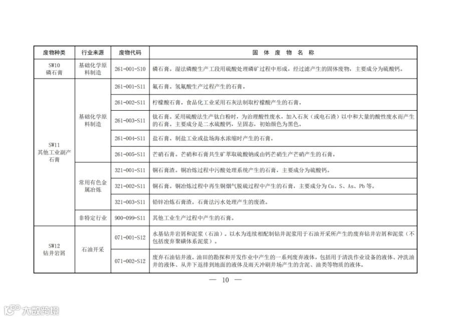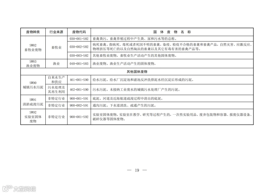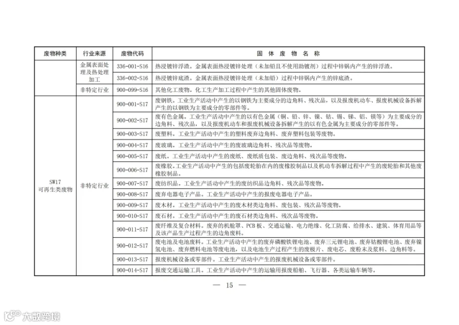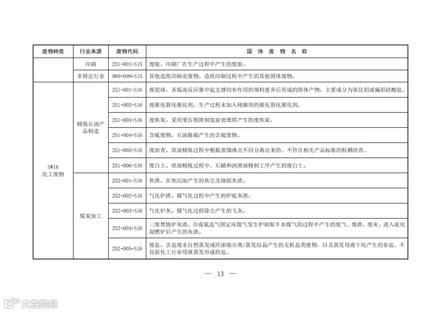 固废分类与代码目录中明确了固体废物的种类、行业来源、废物代码以及固体废物名称。