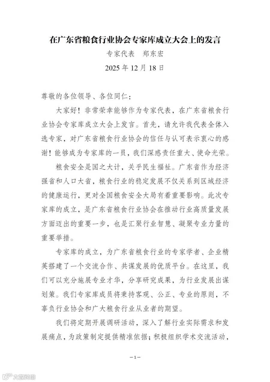 我司郑总作为专家代表在会上发言,分享了在粮食产业创新与实践中的思考与见解。郑总表示,专家库的成立将为广东粮食行业提供强大的智力支持,有助于汇聚行业智慧,解决发展难题,推动产学研深度融合。