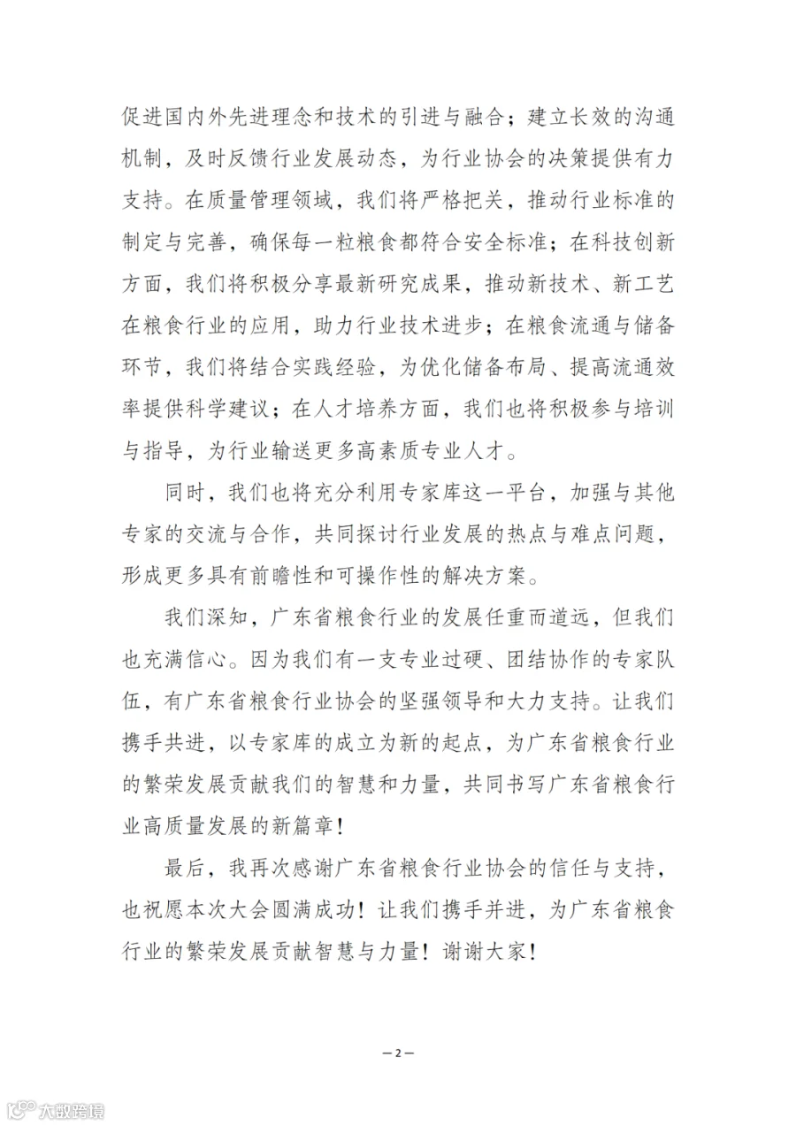 此次专家库的成立,标志着广东省粮食行业进入了以智库为支撑、以创新为驱动的新发展阶段。未来,专家团队将围绕行业关键技术、政策研究、标准制定等领域开展深入工作,为保障广东粮食安全、推动产业转型升级贡献专业力量。