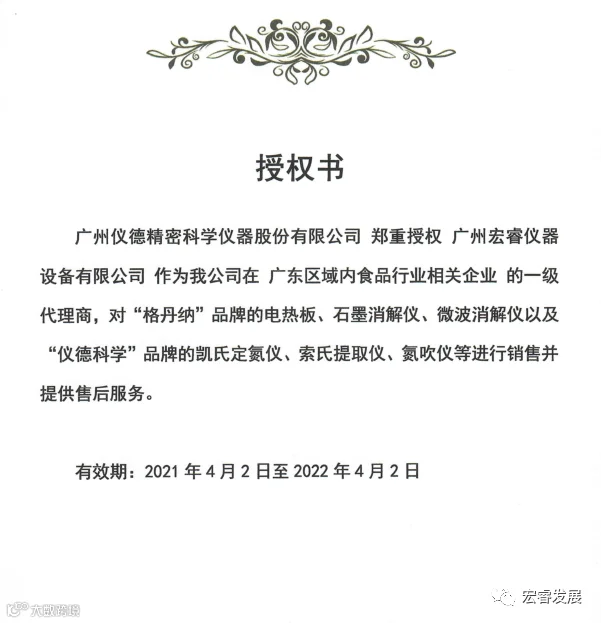 自2021年4月2日开始,广州宏睿仪器设备有限公司获得广州格丹纳仪器有限公司和广州仪德精密科学仪器股份有限公司全线产品的食品行业相关企业一级代理权,销售旗下产品业务深度合作。