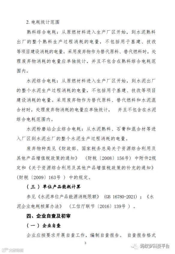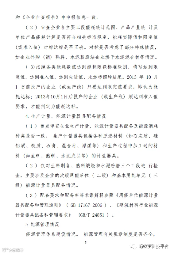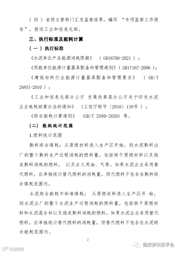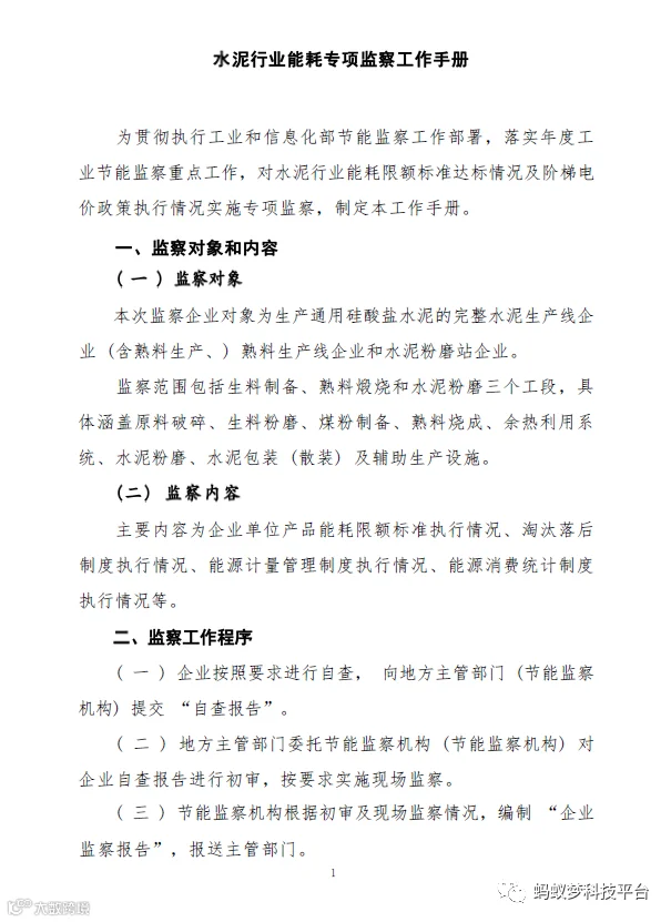 为贯彻执行工业和信息化部节能监察工作部署,落实年度工业节能监察重点工作,对水泥行业能耗限额标准达标情况及阶梯电价政策执行情况实施专项监察,工信部制定了《水泥行业能耗专项监察工作手册》,规定了生产通用硅酸盐水泥的完整水泥生产线企业 (含熟料生产、) 熟料生产线企业和水泥粉磨站企业为水泥行业监察对象;