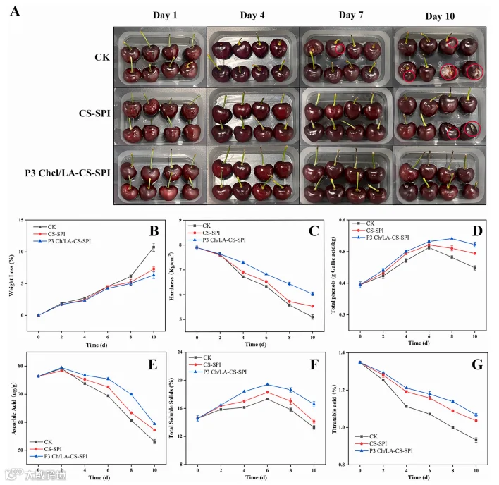 图4.不同涂层处理的甜樱桃在10天贮藏期内的变化;(B)失重率;(C)硬度;(D)总酚含量;(E)抗坏血酸(维生素C)含量;(F) 总可溶性固形物含量;(G)总可滴定酸度。