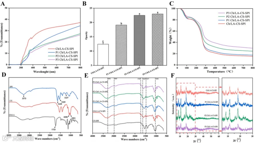 图1.薄膜的理化性质:(A)紫外-可见透光率;(B)不透明度;(C)热重分析;(D)各组分(大豆分离蛋白、壳聚糖及天然低共熔溶剂溶液)的傅里叶变换红外光谱;(E)傅里叶变换红外光谱;(F)X射线衍射图谱。