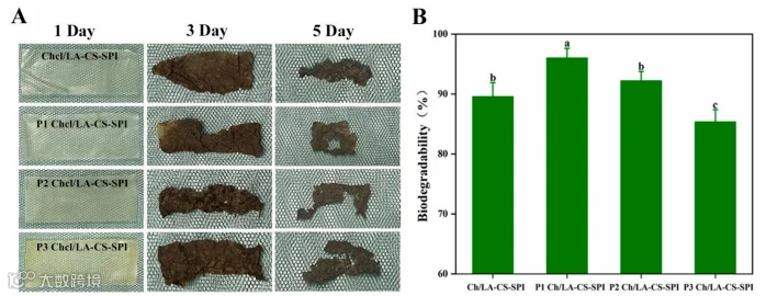 图3.(A)复合薄膜在土壤中的降解情况;(B)复合薄膜第7天的生物降解率。