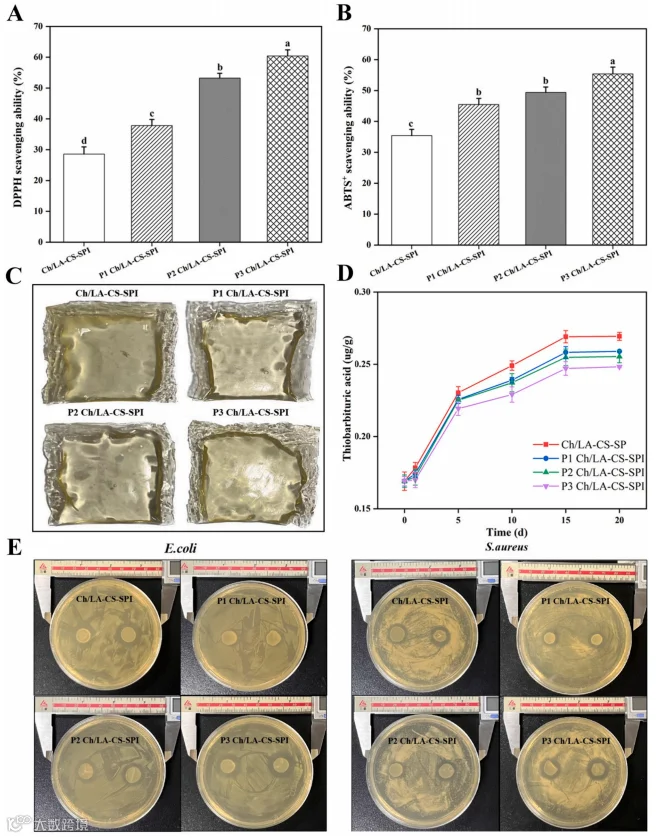 图2.(A)DPPH自由基清除率;(B)ABTS自由基清除率;(C)薄膜封装大豆油;(D)硫代巴比妥酸反应(检测脂质氧化程度);(E)对金黄色葡萄球菌和大肠杆菌的抑菌圈。
