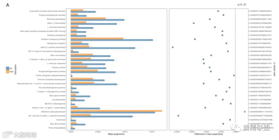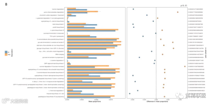 图5 PICRUSt2分析肠道菌群功能。EC数据库(A), pathway数据库(B)。