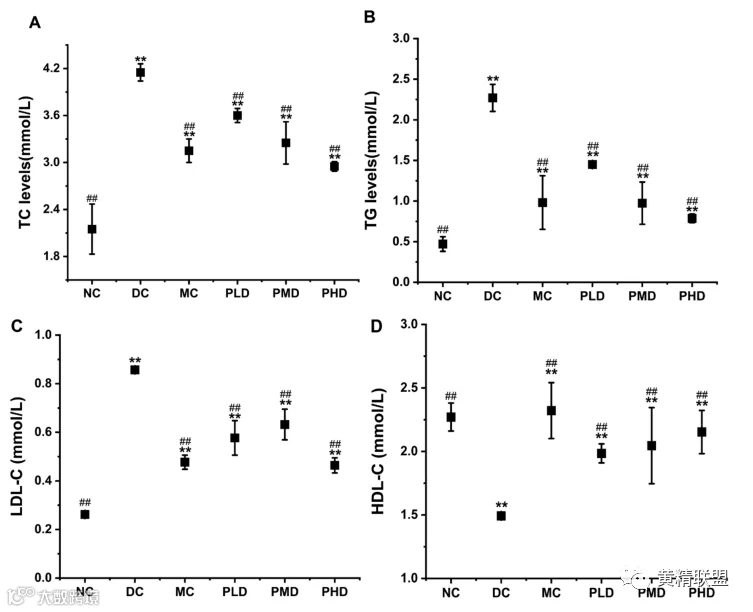 使用试剂盒测定血清中胰岛素、总胆固醇(total cholesterol, TC)、甘油三酯(triacylglycerol, TG)、低密度脂蛋白胆固醇(low-density lipoprotein cholesterol, LDL-C)和高密度脂蛋白蛋白胆固醇(high density lipoprotein cholesterol, HDL-C)的水平。结果表明,黄精皂苷高剂量组(PSS high-dose, PHD)TC、TG、LDL-C水平相对较低,HDL-C水平高于糖尿病对照组( diabetes control, DC)。黄精皂苷可调节糖尿病小鼠的脂质代谢,并在一定程度上抑制了心血管并发症。