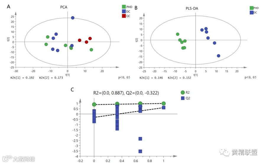 图6 黄精皂苷对糖尿病小鼠代谢模式的影响。主成分分析得分图(A)、PLS-DA得分图(B)、PLS-DA验证图截距:R2=(0.0,0.887),Q2=(0.0,−0.322)(C)。