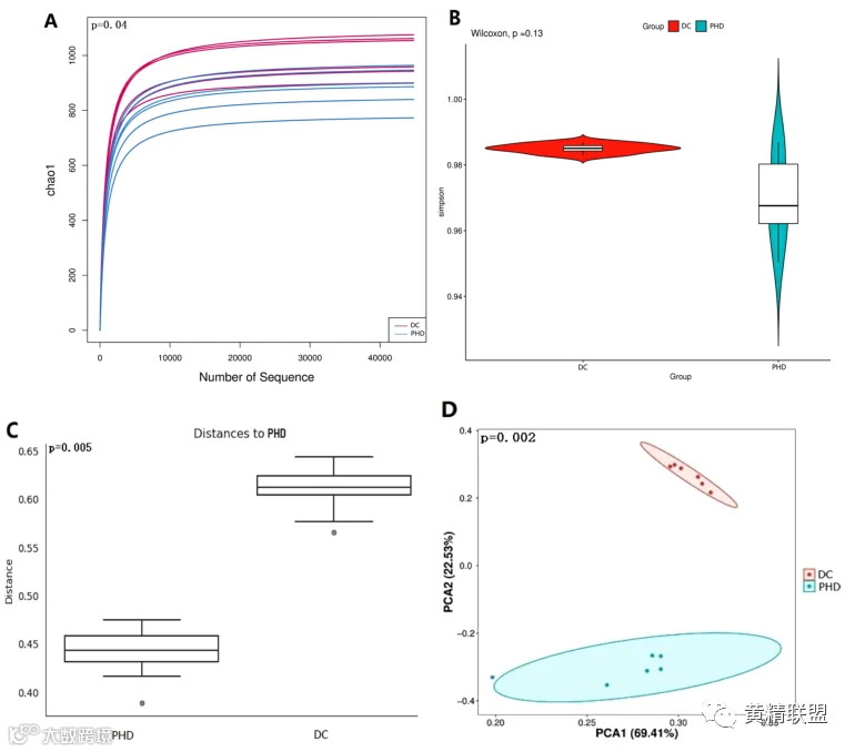 图4 黄精皂苷对2型糖尿病小鼠肠道微生物群多样性的影响。α和β多样性分析:Chao1指数(A)、Simpson指数(B)、组显著性图(C)、主成分分析(PCA)(D)