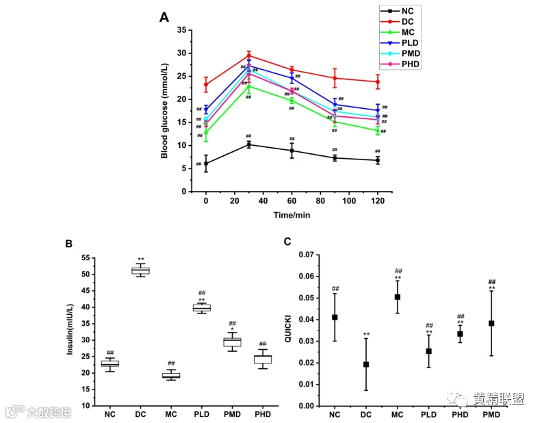 图2 黄精皂苷对2型糖尿病(type 2 diabetes mellitus , T2DM)小鼠口服糖耐量试验(oral glucose tolerance test, OGTT)(A)、胰岛素水平(B)和定量胰岛素敏感性检查指标(quantitative insulin sensitivity check index, QUICKI)指数(C)的影响。8只正常小鼠被分配到常规对照(normal control, NC)组。将40只糖尿病小鼠随机分为5组:糖尿病对照组(diabetes control, DC)、二甲双胍对照组(metformin control, MC)、黄精皂苷低剂量组(PSS low-dose, PLD)、黄精皂苷高剂量组(PSS high-dose, PHD)和PSS中剂量组(PSS medium-dose, PMD)。