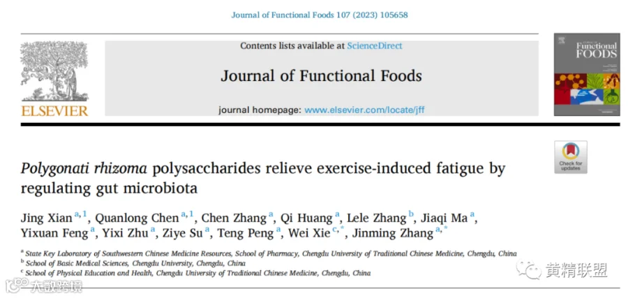 大量研究证明天然多糖可通过刺激肠道微生物多样性,促进有益菌生长,改善疾病。目前,从食物中提取的多糖在治疗肠道相关疾病和调节肠道菌群方面具有显著优势。黄精(Polygonati rhizoma,PR)是一种药食两用的草本植物并且已被原国家卫生部正式批准作为医疗干预和膳食补充剂使用。在印度、韩国和其他亚洲国家的日常保健食品生产中也得到了广泛的应用。黄精多糖(Polygonati rhizoma polysaccharides,PRP)则是黄精的主要活性成分。为证明黄精多糖可以通过防止肠道菌群失调来缓解过度运动引起的疲劳这一假设,成都中医药大学的章津铭教授团队在Journal of Functional Foods(二区,IF5.6)期刊发表了题为“Polygonati rhizoma polysaccharides relieve exercise-induced fatigue by regulating gut microbiota”的研究论文。
