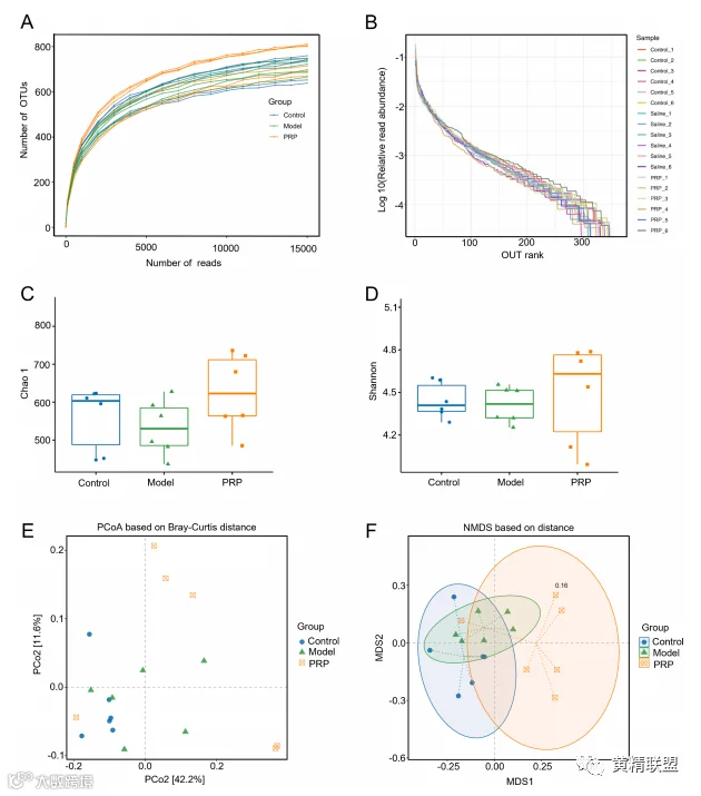 图2. PRP对肠道菌群多样性的影响。(A)稀疏曲线;(B)OUT秩丰度曲线;(C)Chao 1指数;(D)Shannon指数;(E)基于未加权UniFrac的PCoA;(F)NMDS分析。n=6.