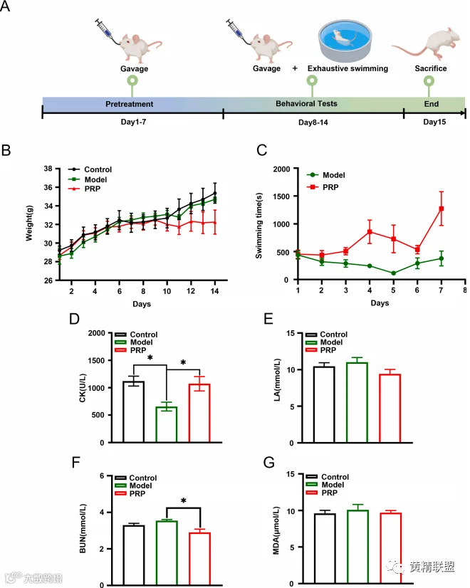 图1. PRP对力竭游泳诱导的疲劳小鼠的影响。(A)动物实验的方案示意图;(B)增重;(C)游泳时间;(D)肌酸激酶;(E)乳酸;(F)血尿素氮;(G)丙二醛。n=6, *P<0.05.