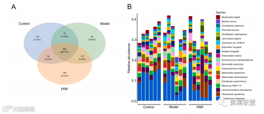 图3. PRP改善了过度运动相关的肠道菌群失调。(A)OTUs的Venn图;(B)PRP在物种水平上对肠道微生物群组成的影响;