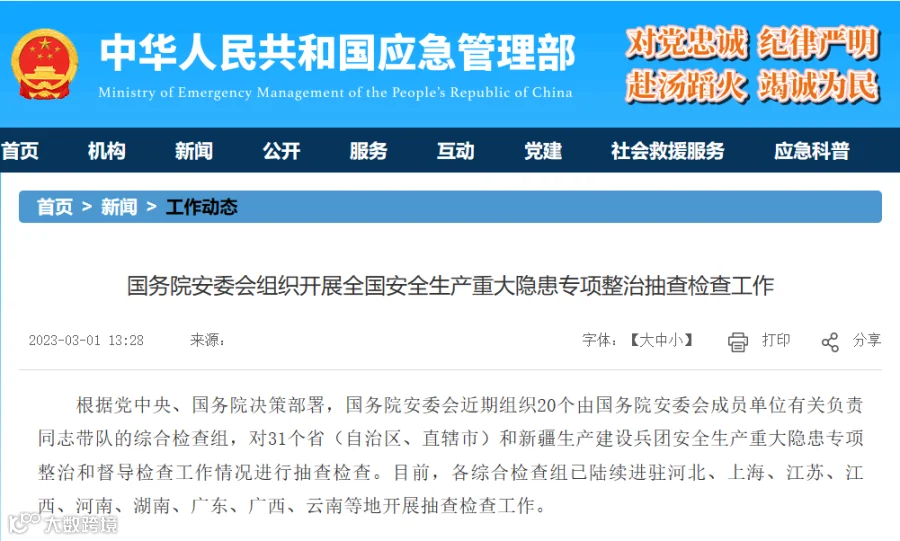 近日,从应急管理部网站获悉,根据党中央、国务院决策部署,国务院安委会近期组织20个由国务院安委会成员单位有关负责同志带队的综合检查组,对31个省(自治区、直辖市)和新疆生产建设兵团安全生产重大隐患专项整治和督导检查工作情况进行抽查检查。目前,各综合检查组已陆续进驻河北、上海、江苏、江西、河南、湖南、广东、广西、云南等地开展抽查检查工作。