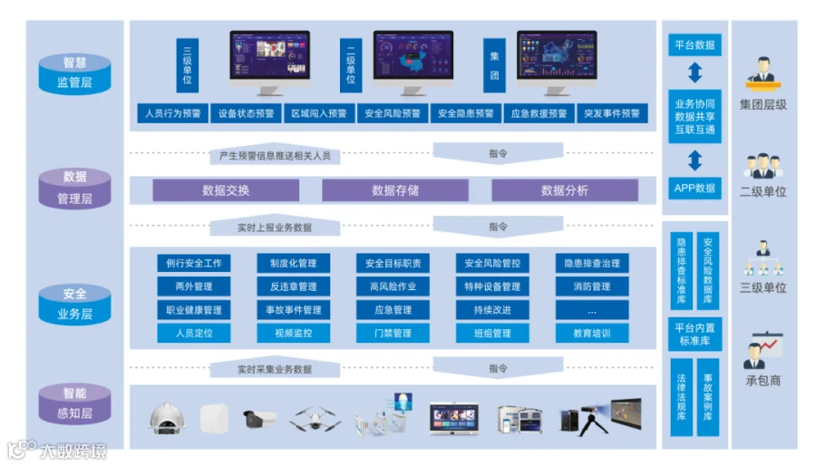1.构建水泥企业智慧安全管控平台,打通从集团、二级单位、三级单位等多层级的线上安全管控模式,实现各主要安全生产管理业务全过程、全流程闭环管控。