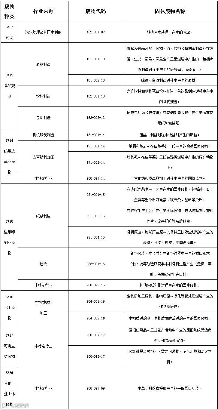 生活垃圾焚烧设施协同处置一般工业固体废物建议名录