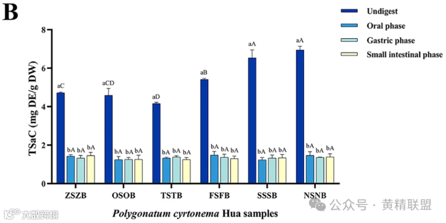 在体外模拟消化过程中,PCH上清液中的TSaC在1.236 ~ 1.485 mg DE / g DW范围内波动,表明TSaC的消化与蒸制次数和消化阶段无关。这可能是由于部分PCH皂苷极性较低,限制了其在消化模拟液中的溶解度。