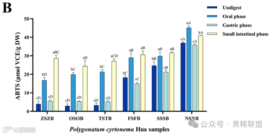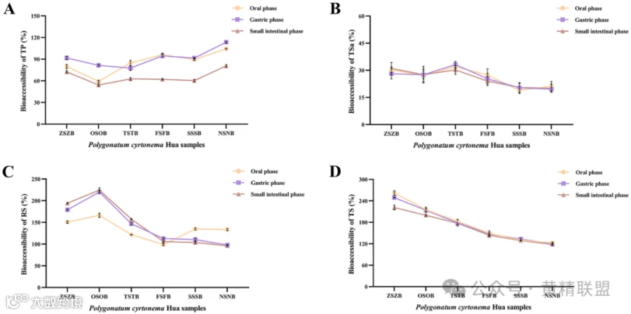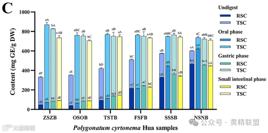 如图3.D所示,总糖生物可及性从262.052%(口腔阶段),249.180%(胃阶段)和221.477%(小肠阶段)下降,顺序为:ZSZB > OSOB > TSTB > FSFB > SSSB > NSNB。这表明蒸制处理对PCH中总糖的生物可及性产生了不利影响。