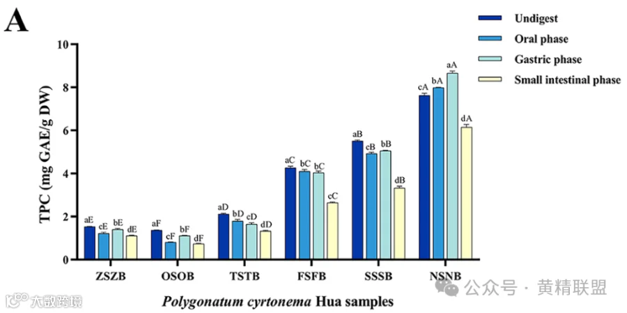 通过比较PCH样品在相同消化阶段的总酚含量(total phenol content, TPC),在每个消化阶段都观察到总体上升趋势(图2A)。TPC的增长与蒸制的频率呈正相关。