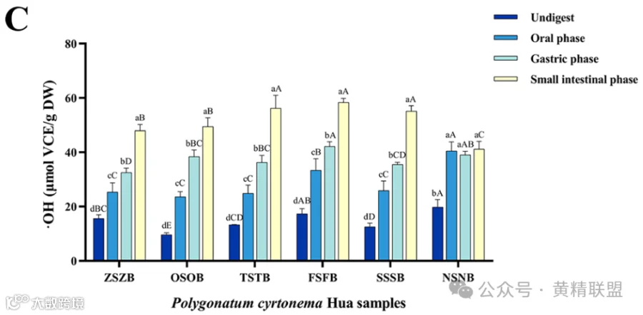 DPPH和ABTS清除能力实验中,PCH的体外抗氧化活性均表现出与蒸制周期持续时间相关的上升趋势(图4A - B)。NSNB样品在消化(即未消化期、口腔期、胃期和小肠期)的各个阶段均表现出较好的DPPH和ABTS自由基清除能力。