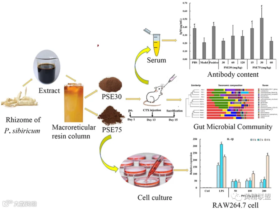 在这篇研究中,作者探究了黄精去除多糖后的提取物PSE30 (Polygonatum sibiricum ethanol 30) and PSE75 (Polygonatum sibiricum ethanol 75)的免疫调节活性。材料制备是由1 kg黄精粉末加入75%乙醇回流提取后过滤,滤液在45℃下减压旋蒸去除乙醇。将1.0 g/mL的提取物置于D101大孔树脂中吸附1 h后用水洗柱去除杂质,再用30%乙醇洗脱得到PSE30馏分,用75%乙醇洗脱得到PSE75馏分。然后,将PSE30、PSE75分别用D941大孔树脂处理,用70%乙醇洗脱分别得到得率为3.62%的PSE30和1.63%的PSE75。